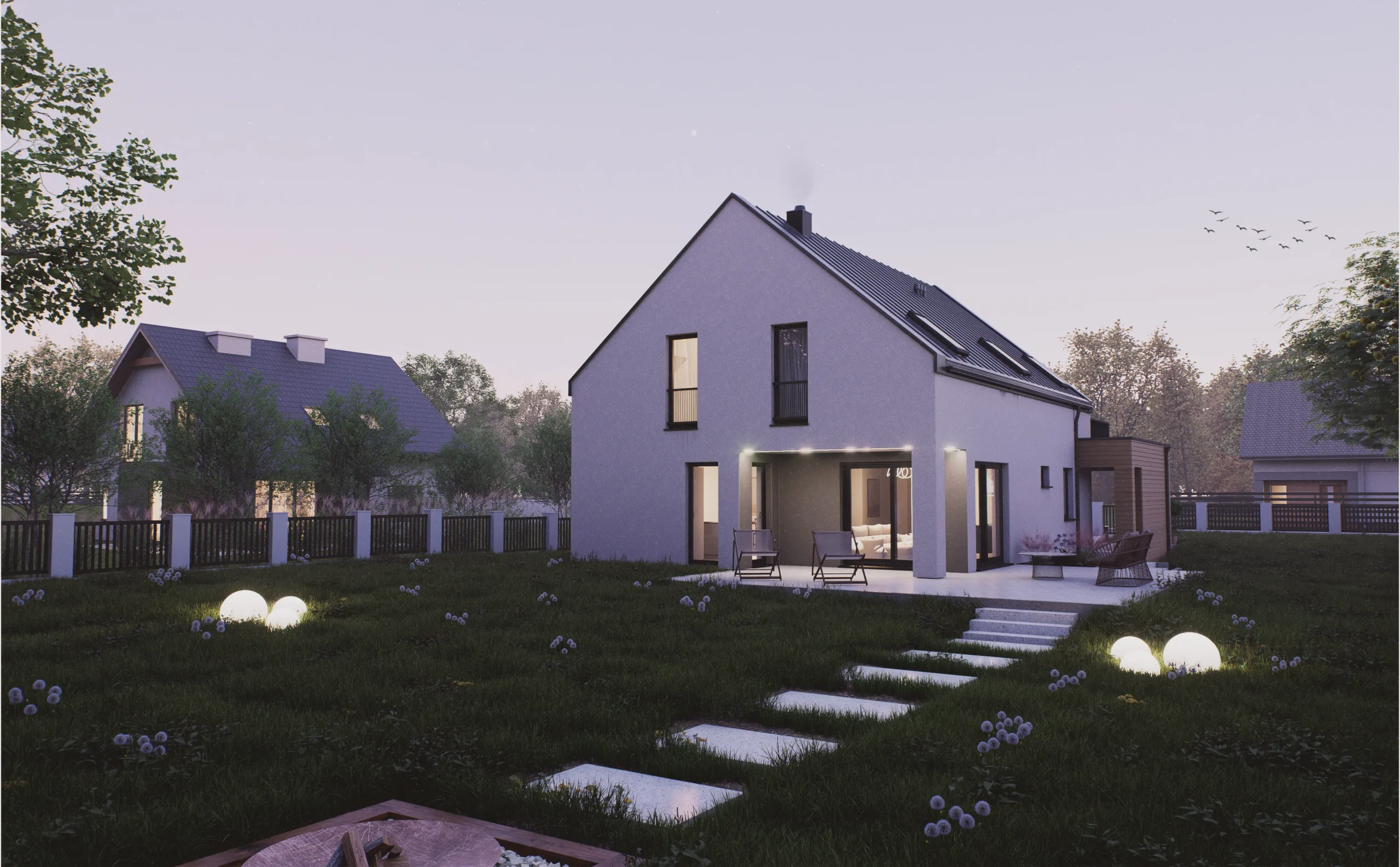 Nowoczesny, niepodpiwniczony dom o trzytraktowym układzie funkcjonalnym został zaprojektowany z myślą o czteroosobowej rodzinie, która ceni wspólnie spędzany czas. Centralnie usytuowana oś budynku prowadzi od wejścia aż po salon, którego zwieńczeniem jest kominek – serce strefy dziennej.