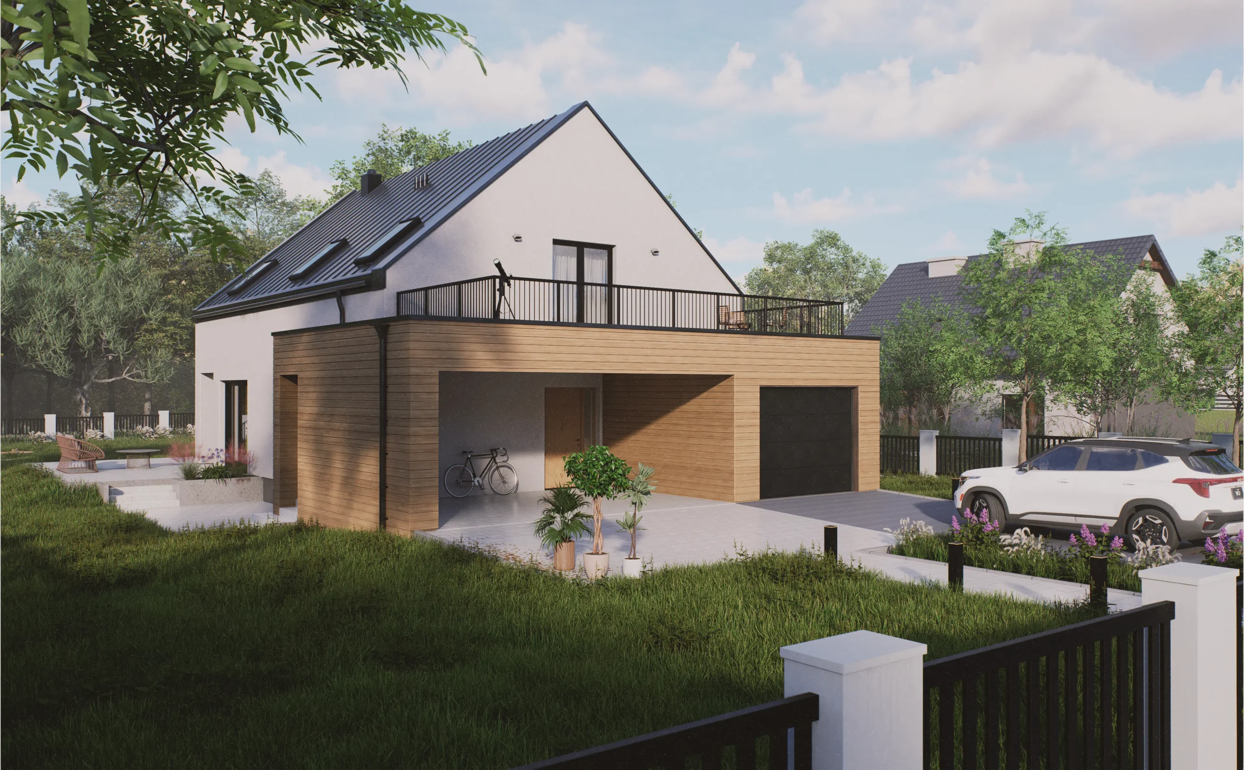 Wejście zostało zaprojektowane pod dużym zadaszeniem, które pełni kilka funkcji: chroni strefę wejściową, zapewnia zadaszenie dla dwóch miejsc parkingowych, a jednocześnie stanowi podstawę prywatnego tarasu na dachu. Taras ten należy do strefy master – azylu rodziców, w którym znalazły się: sypialnia z prywatną łazienką, garderobą, miejscem do pracy oraz bezpośrednim wyjściem na zewnętrzną przestrzeń.