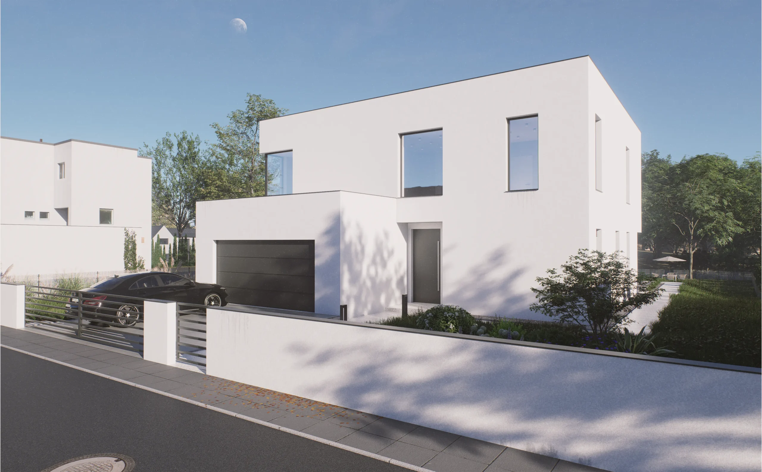 Bryła budynku została oparta na grze trzech przenikających się prostopadłościanów, co nadało jej nowoczesnego i dynamicznego charakteru. Zewnętrzne wykończenie utrzymane jest w duchu minimalizmu. Dom pokryto białym tynkiem silikonowym, a fasadę uzupełniają duże przeszklenia, które optymalnie doświetlają wnętrze i zacierają granicę między domem a ogrodem.