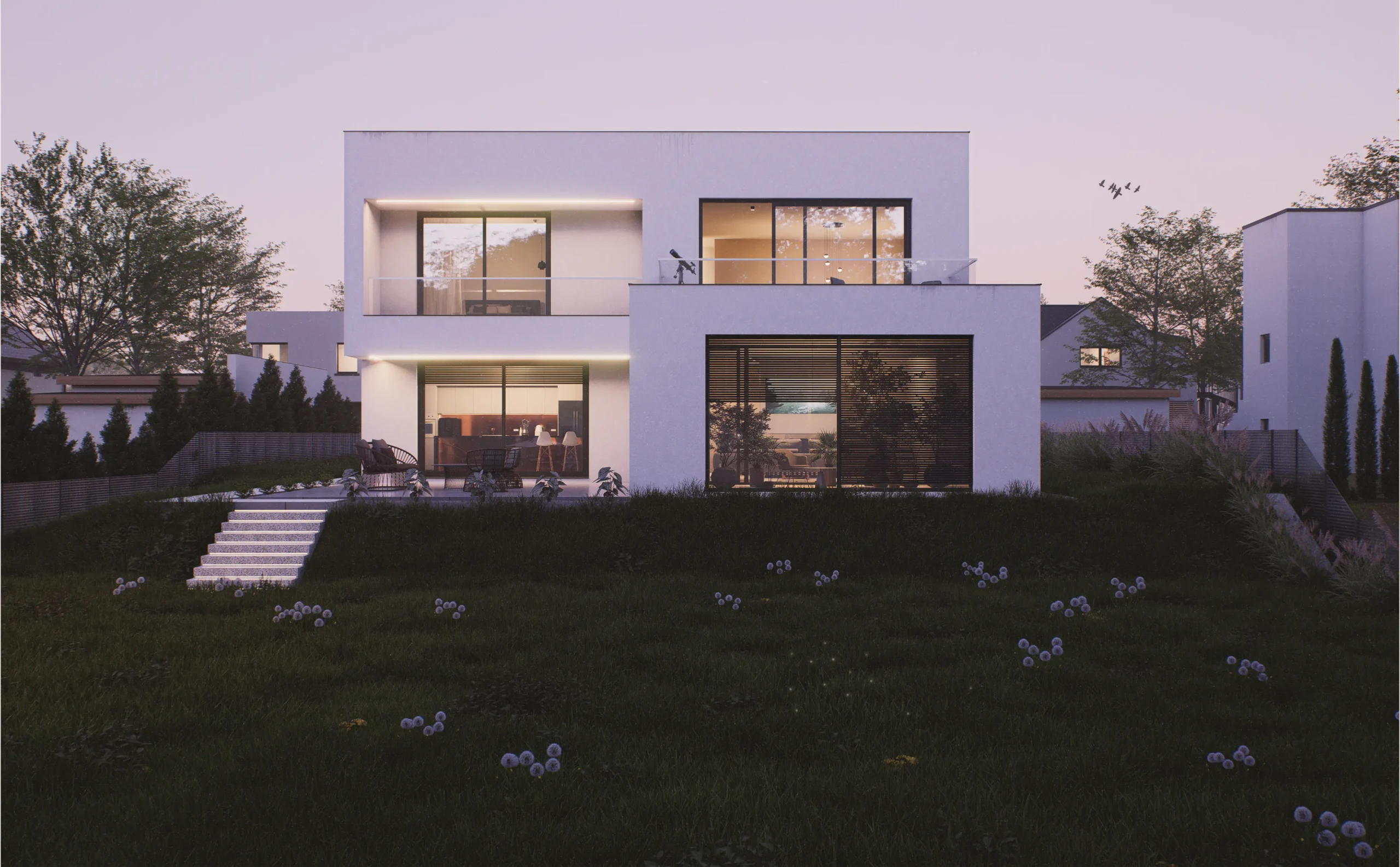 Dom wyposażony jest w dwa przestronne tarasy, które umożliwiają korzystanie z uroków ogrodu o różnych porach dnia. Dzięki przemyślanej orientacji budynku względem stron świata, wnętrza są jasne, a przestrzeń zewnętrzna funkcjonalna i przyjazna użytkownikom.